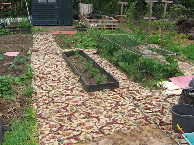 Looking the other way you can see where I have laid my 'special' carpet and some of the fabric. I need to make LOADS more pins (wire bent into an 'n' shape), but it looks sooo much better already with just a few of the paths covered. I WILL NOT WEED PATHS ALL SUMMER!